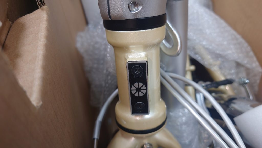 因みにTERNにも似たような台座があります。こちらもバッジで隠されていることが多いのですが、TERNの台座は2つのボルト穴となっています。真ん中のボルト穴はありませんが、こちらにも取り付けは可能です(代理店にも確認済み)。但しTERNの台座の方がダホンの台座よりも少しネジ穴が浅く、DAHONフレーム用のオプションパーツとして発売されているバレットトラスに標準で付属しているボルトはTERNの台座に対して少し長いので、TERNの台座に合った少し短めのボルトを手配していただくか、もしくはワッシャーやスペーサーなどでボルトの有効なネジ部分長さを調節してあげる必要があります。