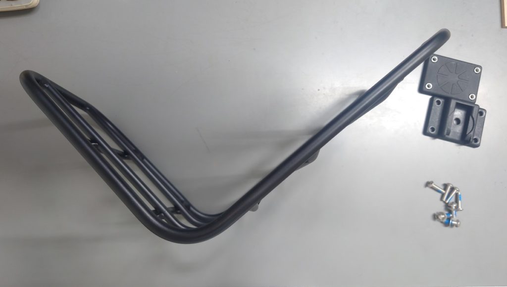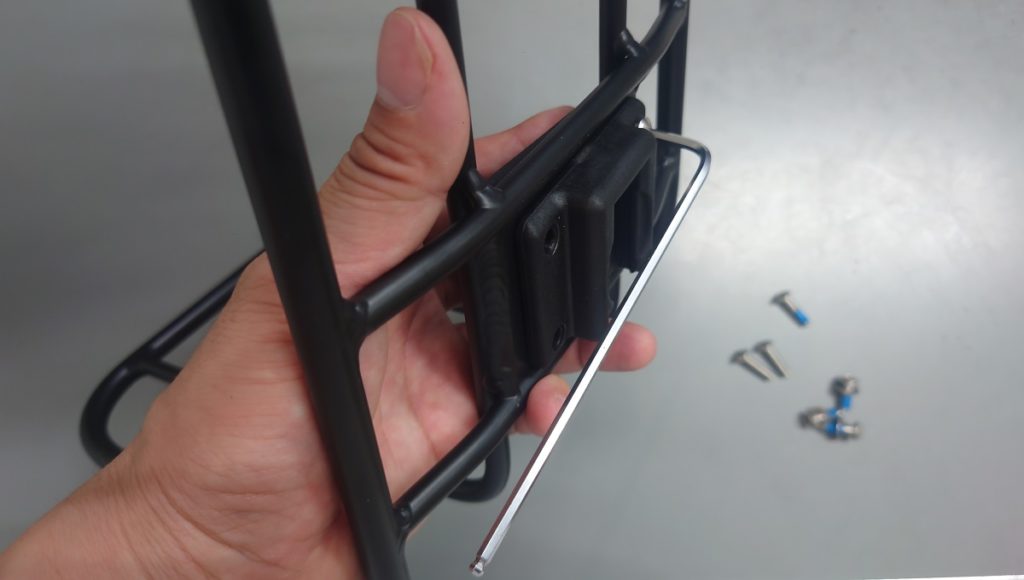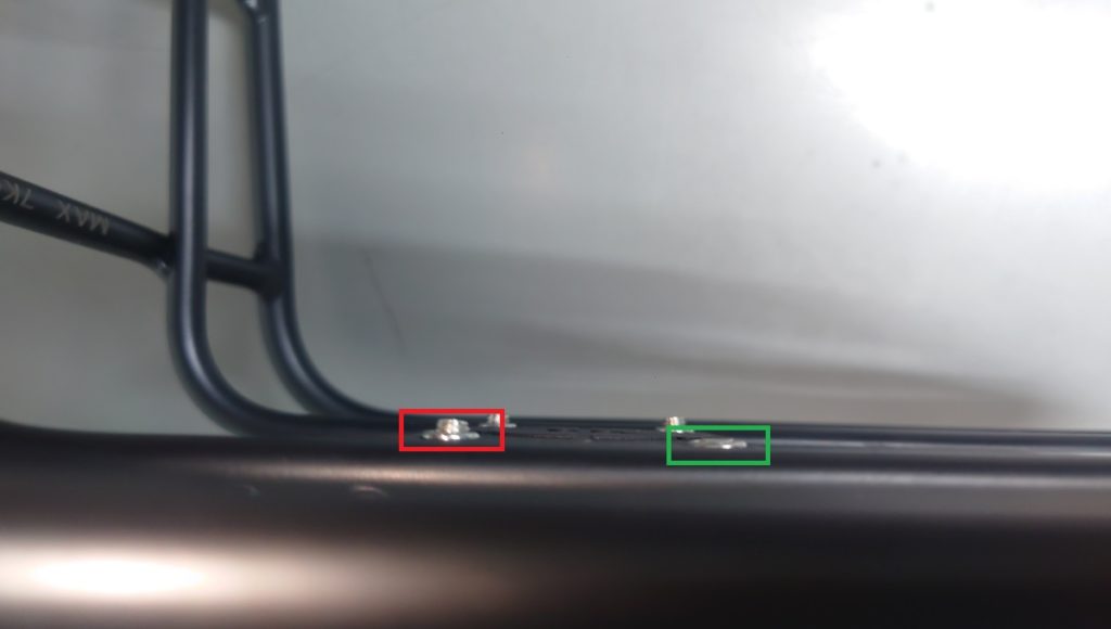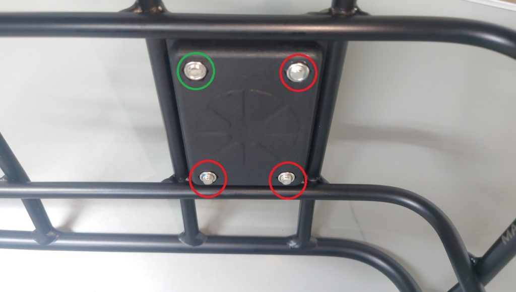 取り付けてみました。ここで一つ問題が。クイックカプラーはボルト4本でフロントラックに取り付けるのですが、ボルトの先端が約2mmほど突き出してしまいます。一枚目の画像の赤色の丸で囲った箇所はネジ山が飛び出しているのがお分かりいただけると思います、。この突き出しが荷物を載せる反対側であれば良いのですが、構造上荷物を載せる側にボルトの余りが突き出てしまうのですね。