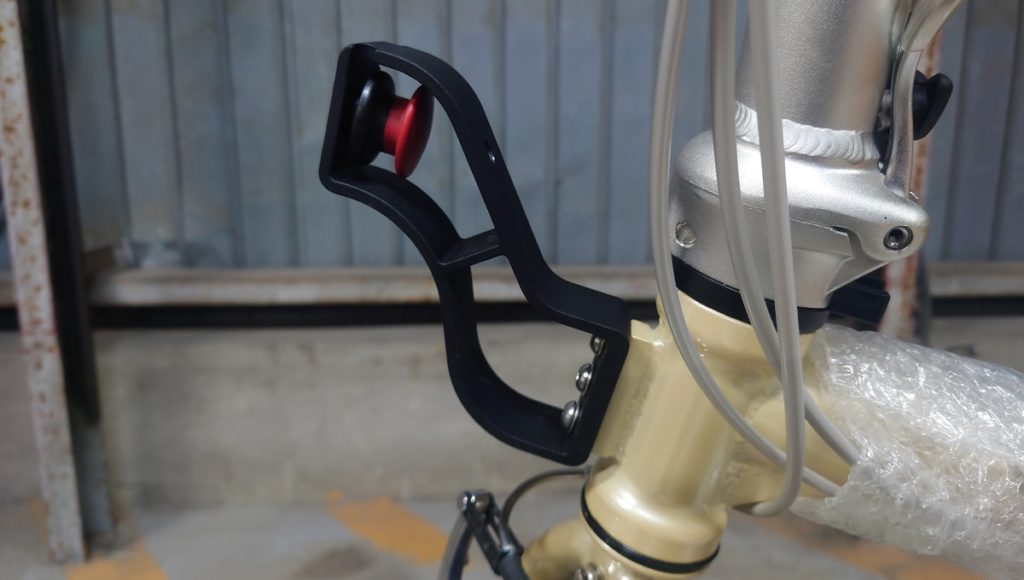 一般的な自転車の前かごは前輪からカゴ足という支えを必要とするのでハンドルの操舵と同じ動きをしますが、こちらはヘッドチューブに固定されているので前輪と同じ動きをしません。一般的な自転車に慣れていると少し違和感を覚えるかもしれませんが慣れればどうってことありませんし、ハンドルの動きで荷物が振り回されることがないわけですから、慣れればこちらの方が安定するような気もします。
