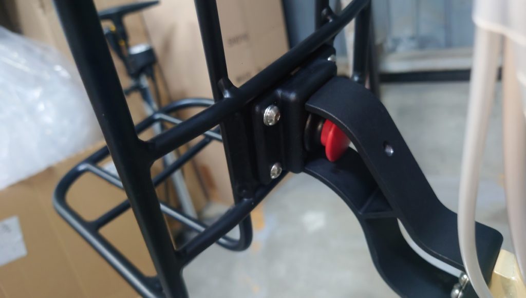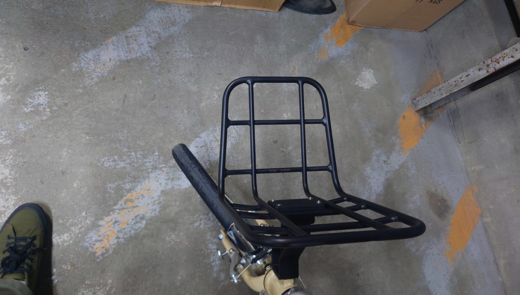 ラックを装着してみました。ラックの取り外しは赤いツマミを引っ張りラックを上に引き上げれば容易に行えます。装着は上からはめ込むだけ。取り付けた時の節度感はなかなか良い感じです。フロントラックにはゴムバンドが付属しておりますので、荷物を載せて付属のバンドもしくは何かお使いいただきやすいバンドで縛っていただければ、バックパックを背負うことなく荷物を運ぶことが出来ます。